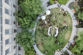 This cozy, outdoor space is tucked away alongside the central Atrium. The East Garden includes an oval lawn with walking paths and a large patio, creating the perfect setting for a garden party, cocktail hour or wedding ceremony.