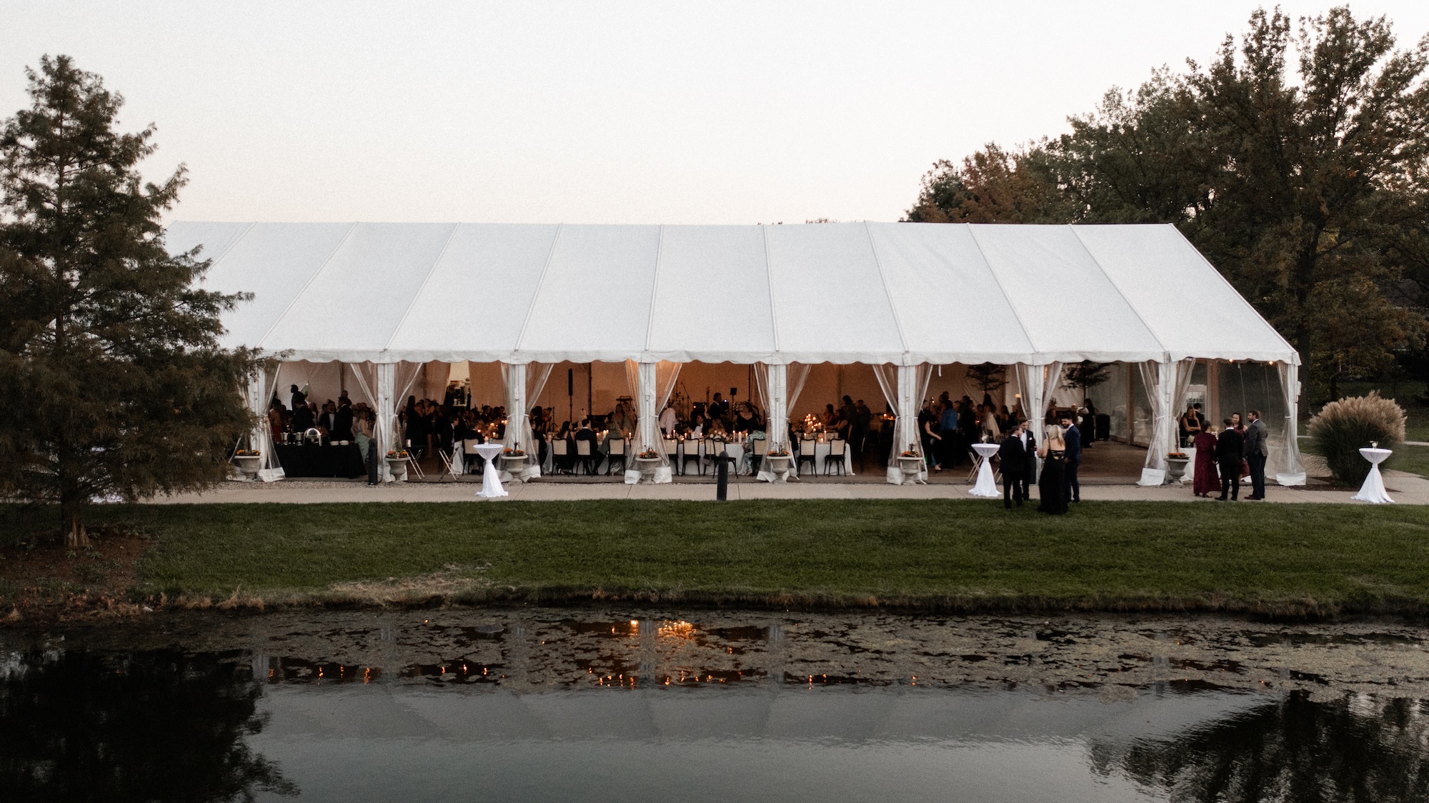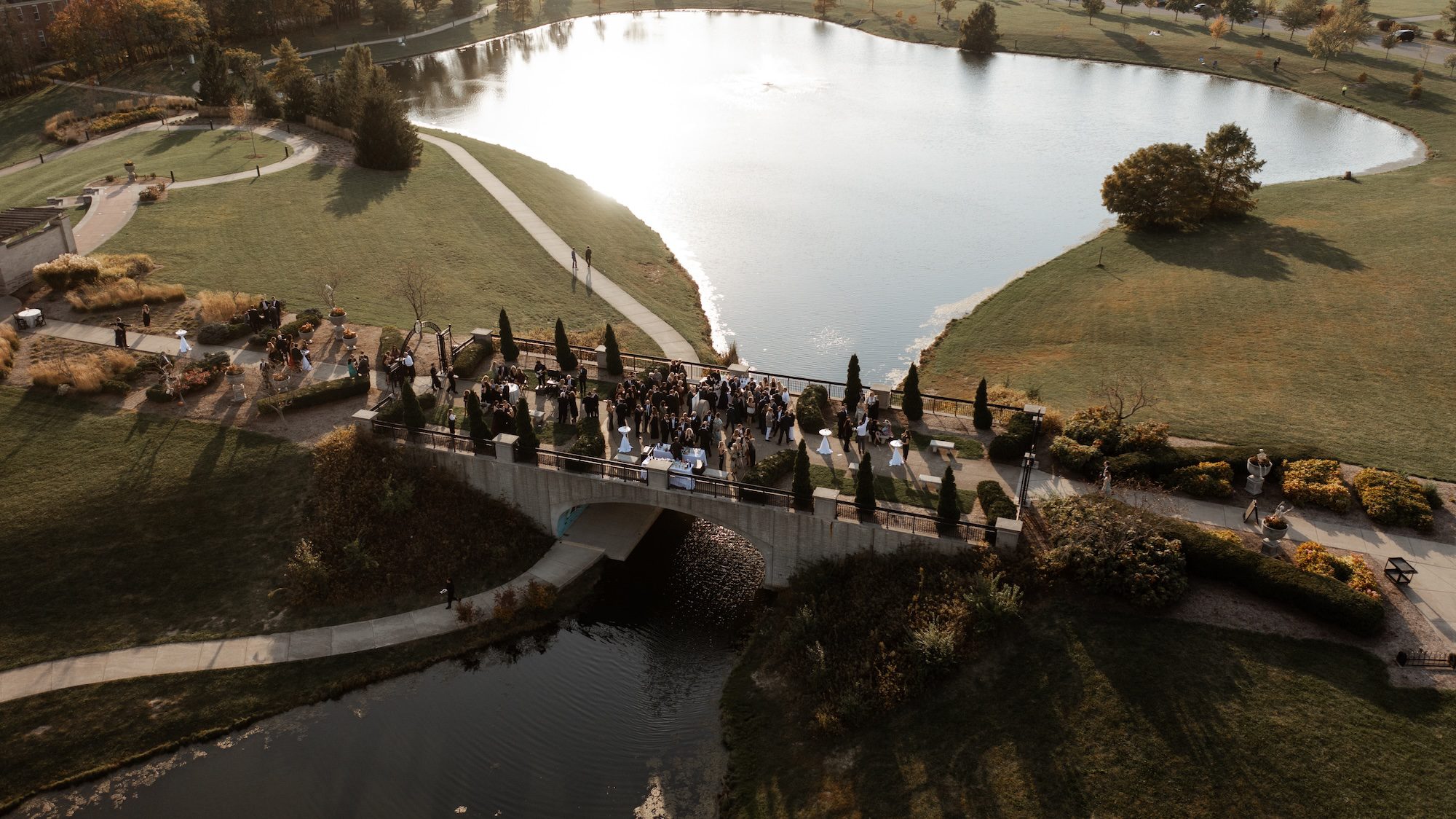 An open-air, tented pavilion accented with glowing string lighting creates a timeless setting for a wedding reception. Overlooking a serene reflecting pond, Cripe Pavilion is surrounded by paved walkways and lush green spaces, allowing the celebration to effortlessly spill outdoors and giving guests room to mingle, stroll and enjoy the scenery.