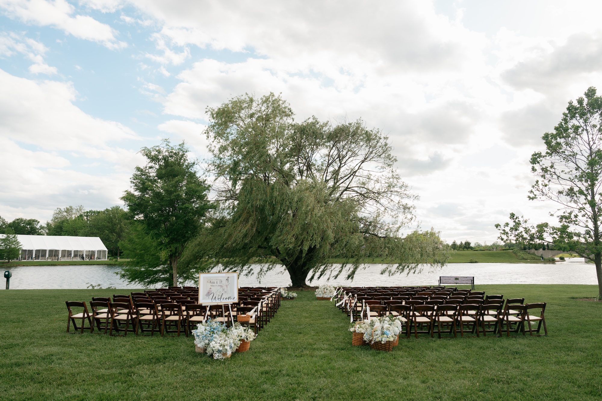 A graceful willow tree drapes over the edge of a tranquil lake, creating another naturally romantic setting for a ceremony. Surrounded by acres of open grass dotted with trees, the space feels peaceful and expansive.