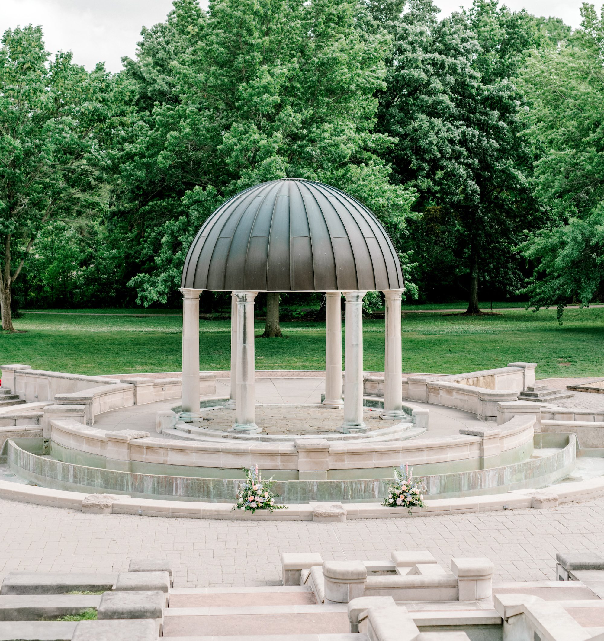Tiered limestone steps lead to an elevated gazebo, where cascading fountains frame a dramatic and unforgettable outdoor ceremony setting.