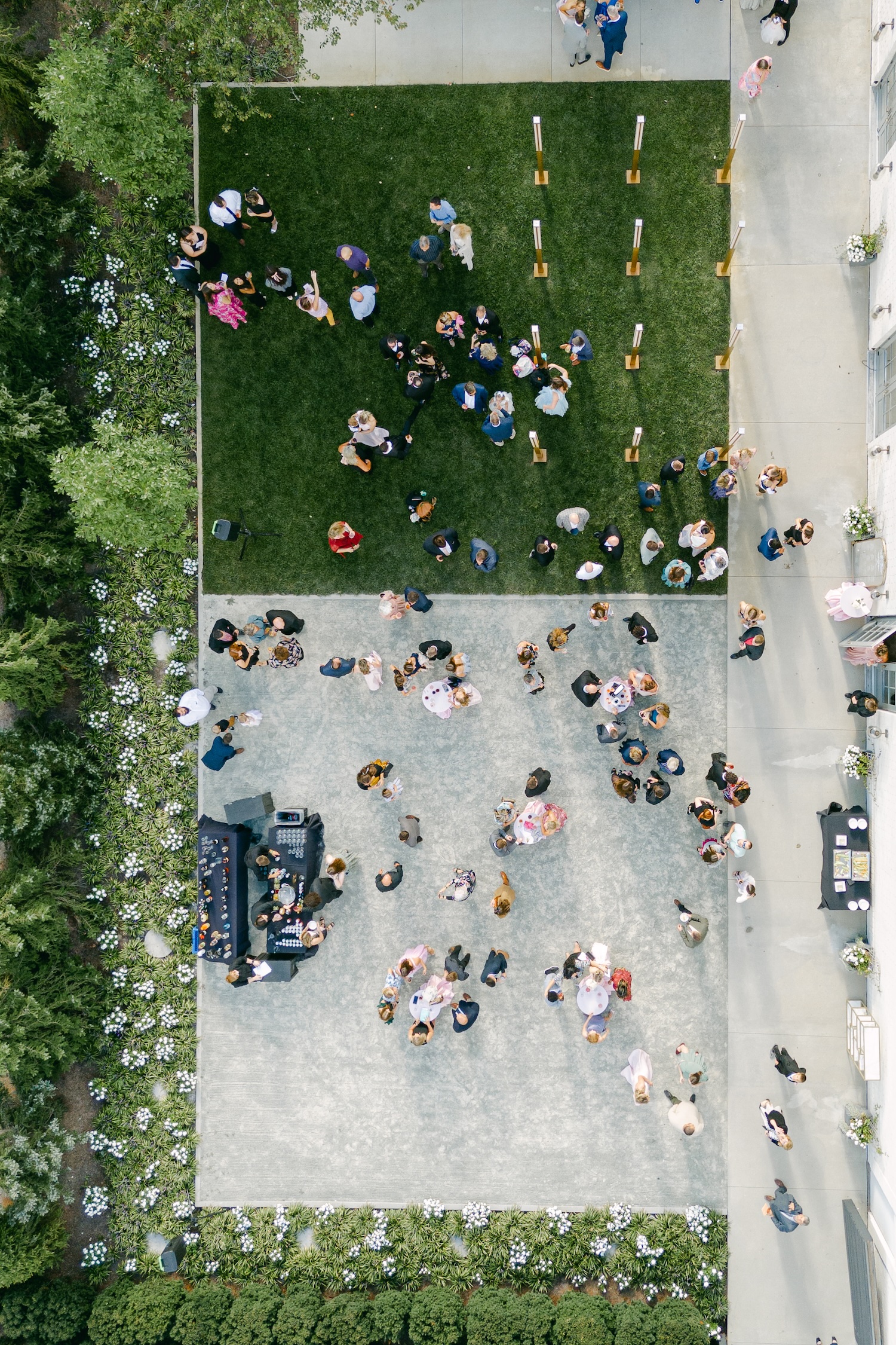 Just beyond the Ginkgo Ballroom’s French doors, the walled Ginkgo Courtyard offers an intimate, private setting ideal for wedding ceremonies, cocktail hours, or late-night celebrations. Beautiful landscaping and soft Edison bulb string lights create a warm, inviting ambiance.