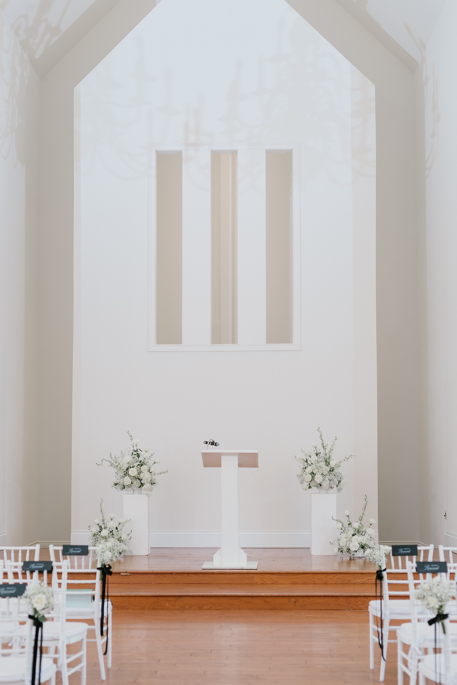 At the end of the aisle, the altar serves as a thoughtfully designed space for couples to say “I do.” A set of low, easy-to-navigate steps gently elevates the couple, ensuring a beautiful view for their guests.