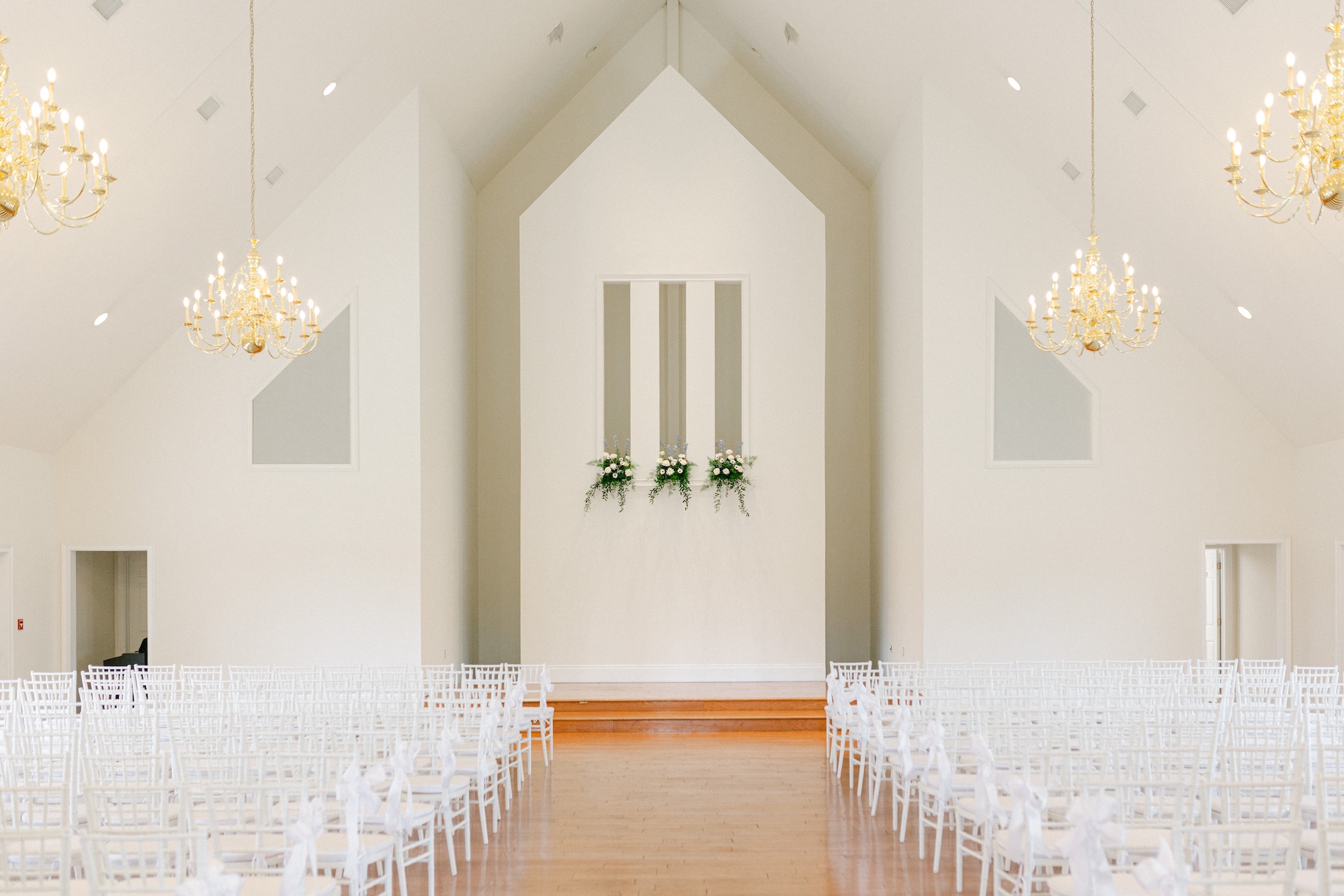 Just beyond the welcoming foyer, the ceremony hall unfolds into a grand space featuring soaring ceilings, state-of-the-art acoustics, real wood floors, and elegant white Chiavari chairs.