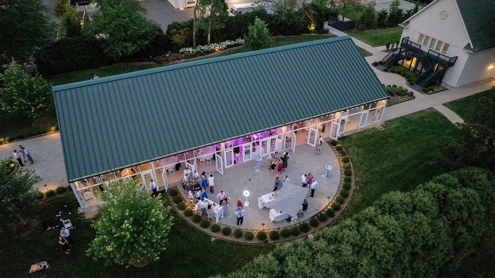 The glass walled Garden Pavilion offers a truly unique wedding reception setting, complete with dramatic ceiling drapery, glowing string lights and panoramic views of manicured grounds. Open year-round, this heated structure has walls of French doors connecting your guests to private patios used for cocktail hour, sunset photos, late-night cigars, and picturesque send offs. The Garden Pavilion can be used as a standalone wedding ceremony and reception venue, or paired with the nearby Chapel. Paired with our chef-driven culinary team, highly trained service staff and all-inclusive rentals package, your experience will feel seamless, elevated, and truly memorable for you and your guests.